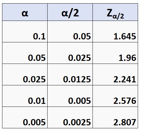 z alpha values table